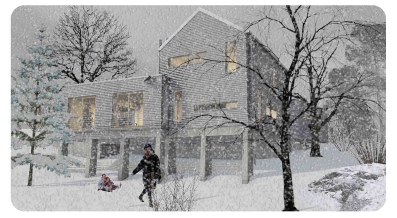 Villaprojekt om 5 ROK i brant sluttning med konstruktion på kontreforer. Fasad i rostfri plåt. Projekt ej realiserat.